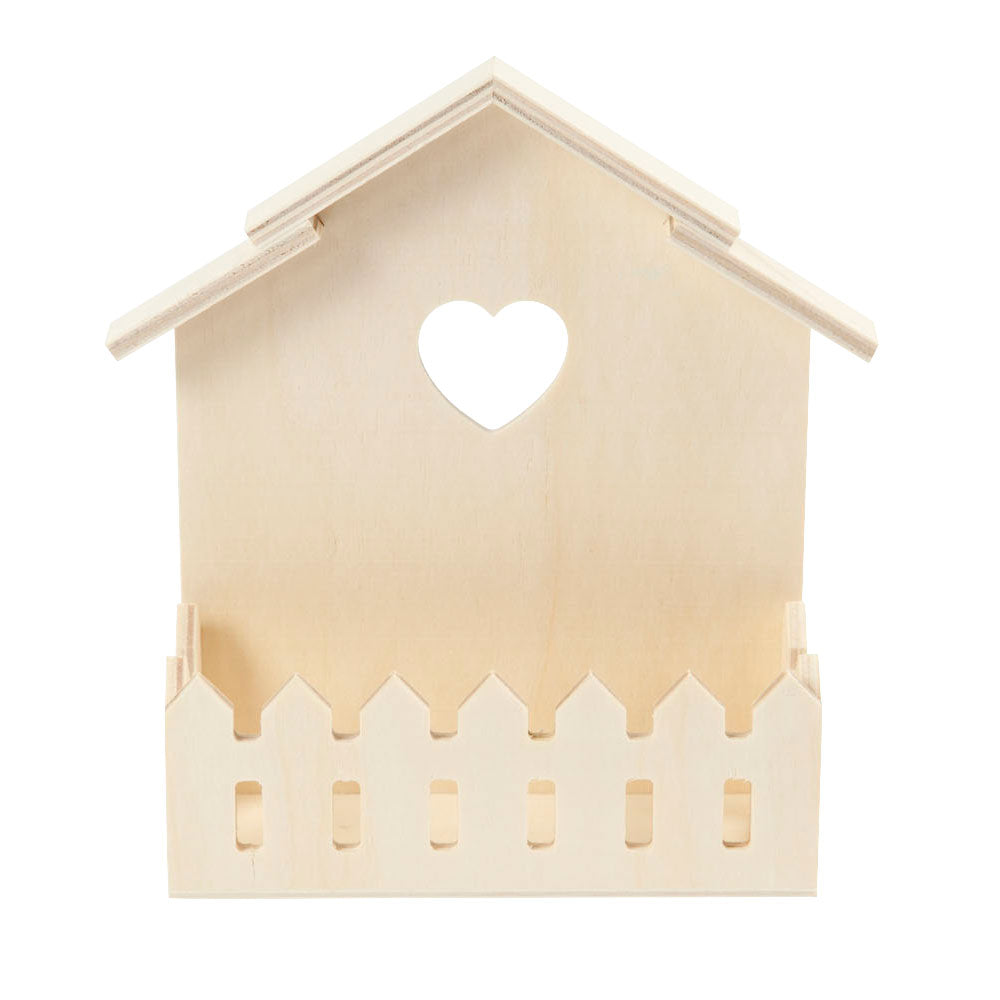 Dit kleine plankje van licht hout is ontworpen als een huis met een hek. Geef het huisje kleur met stiften en/of verf en zet iets leuks op het plankje. Leuk om op te hangen! Inclusief ophangsysteem. Het plankje is 16,5 centimeter hoog en 13 centimeter breed. De diepte van het huisje is 5,5 centimeter.