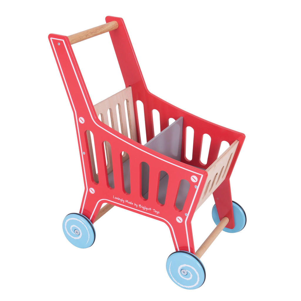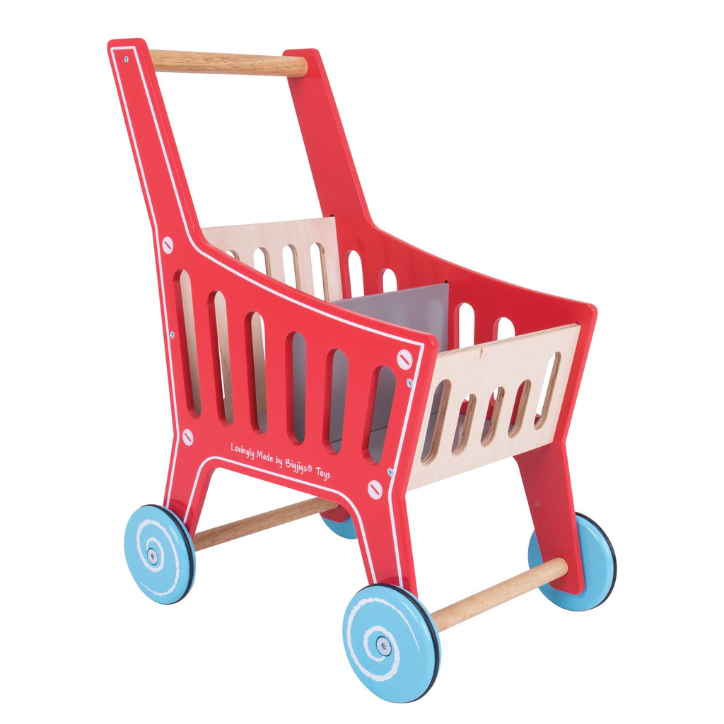 Doe boodschappen in je denkbeeldige winkel met dit houten winkelwagentje. Duw het karretje op de geruisloze wielen vooruit en verzamel alle boodschappen die je nodig hebt. Dankzij de twee aparte vakken kun je de boodschappen gemakkelijk uit elkaar houden. Het winkelwagentje is gemaakt van hout en is prachtig afgewerkt. Spelen met het winkelwagentje stimuleert de ontwikkeling van fantasie, coördinatie en geeft inzicht in oorzaak en gevolg.