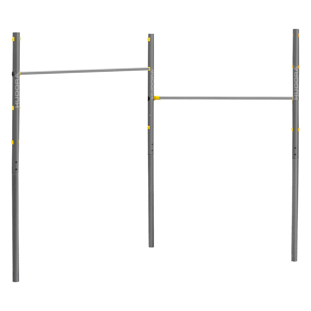 Draai, zwaai of bungel ondersteboven. Omdat het gewoon leuker is met twee personen, biedt de Fabian Pro dubbele turnstang veel turnplezier voor twee. De rekstok bestaat uit 3 robuuste steunpalen die direct in de grond verankerd kunnen worden. De horizontale spijlen zelf zijn gemaakt van gepoedercoat roestvrij staal en zijn daardoor roestvrij. Niet alleen de weerbestendige materialen beloven langdurig plezier van de Fabian Pro: dankzij de in 4 niveaus verstelbare hoogte - van 71,5 cm tot 150 cm - wordt de dubbele rekstok een permanent fitnesshulpmiddel. Inbegrepen in de set: bevestigingsmateriaal voor verankering in beton. Bovendien kunnen de verstelbare hoeken tot 80° worden aangepast aan alle mogelijke trainingsvoorkeuren - voor creatieve gymnastiek zonder grenzen.