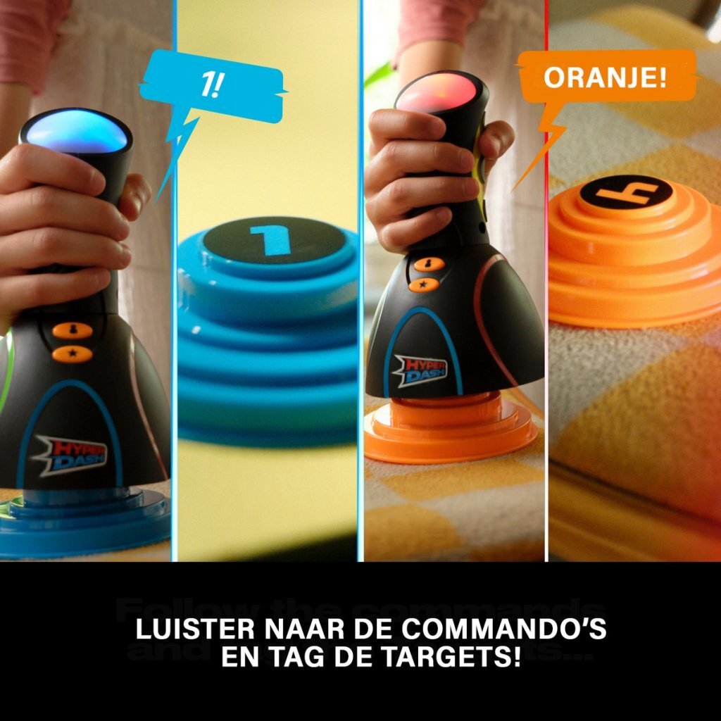 Hyper Dash is een elektronisch racespel, waar je reactievermogen optimaal wordt getest! Het spel bestaat uit de elektronische Hyper Dash Tagger en 5 gekleurde Targets met nummers erop. Maak een speelveld met de 5 Targets. Er zijn spelniveaus, van makkelijk tot uitdagend. Op niveau 1 tag je alleen gekleurde targets. In niveau 2 worden kleuren én cijfers gecombineerd. Op niveau 3 volgen razendsnelle opdrachten met meerdere doelen tegelijk! De levels worden steeds moeilijker. Speel solo of in teamverband en race tegen de klok ? kies 30, 60 of 90 seconden. Luister goed naar je Tagger en houd je ogen op het licht: ?Groen! 5! Rood! 2!? ? en tag zo snel mogelijk de juiste targets. Wie reageert het snelst? Wie scoort het hoogst? Hyper Dash is actie, fun én competitie voor jong en oud! Ben jij klaar om te racen? Let's Hyper Dash!