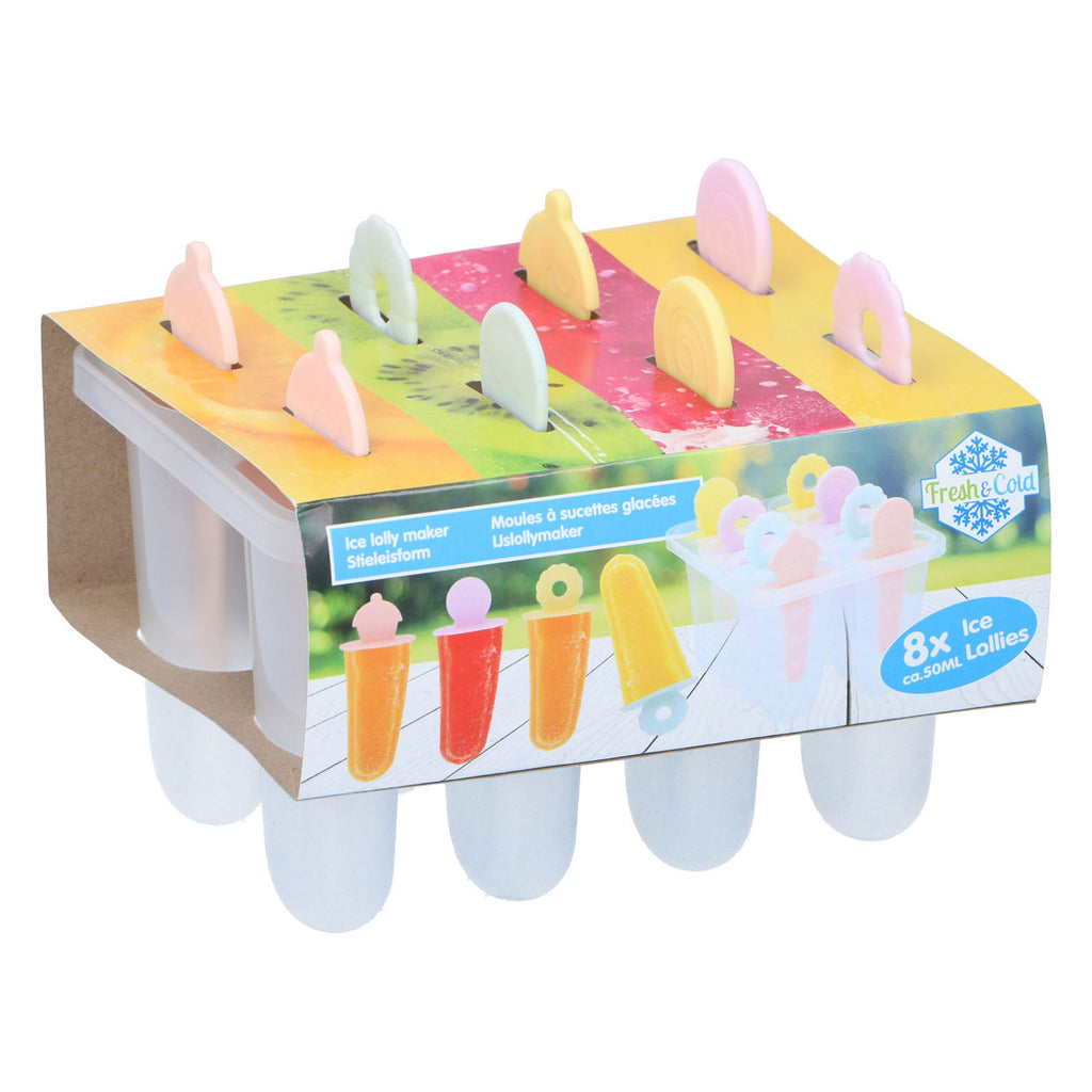 IJslollymaker om 8 ijsjes mee te maken. De set is gemaakt van kunststof en bevat een houder en 8 stokjes om ijsjes mee te maken. Er kan ca. 50 milliliter in één ijsjeshouder.