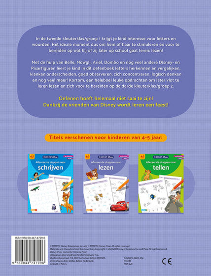 Met de hulp van Belle, Mowgli, Assepoester, Dombo en nog veel meer andere Disneyfiguren leert je kind in dit oefenboek letters herkennen en vergelijken, klanken onderscheiden, goed observeren, zich concentreren, logisch denken en nog veel meer! Kortom, een heleboel leuke opdrachten om later vlot te leren lezen en je voor te bereiden op de derde kleuterklas/groep 2.
