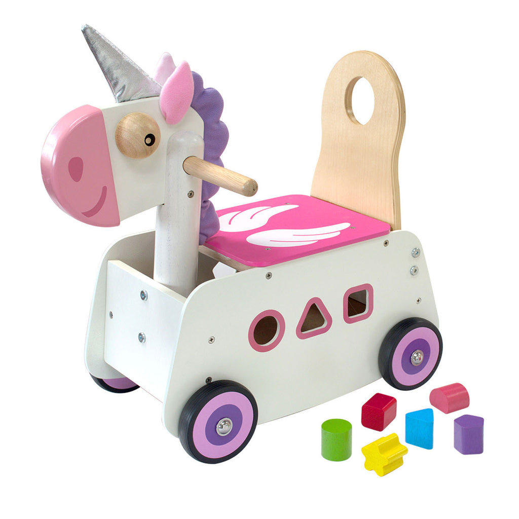 Ga op pad met deze leuke I'm Toy Loop- en Duwwagen Eenhoorn. De duwkar heeft de vorm van een unicorn en heeft mooie paarse en roze accenten. Ideaal om te leren lopen, maar je kan er nog zoveel meer mee. De bak van de duwwagen is een vormenstoof waarmee kinderen verschillende vormen kunnen herkennen. In de bak zelf is er ook nog genoeg ruimte om diverse spulletjes op te bergen. Ben je moe van het lopen, rust dan uit op de roze zitting.