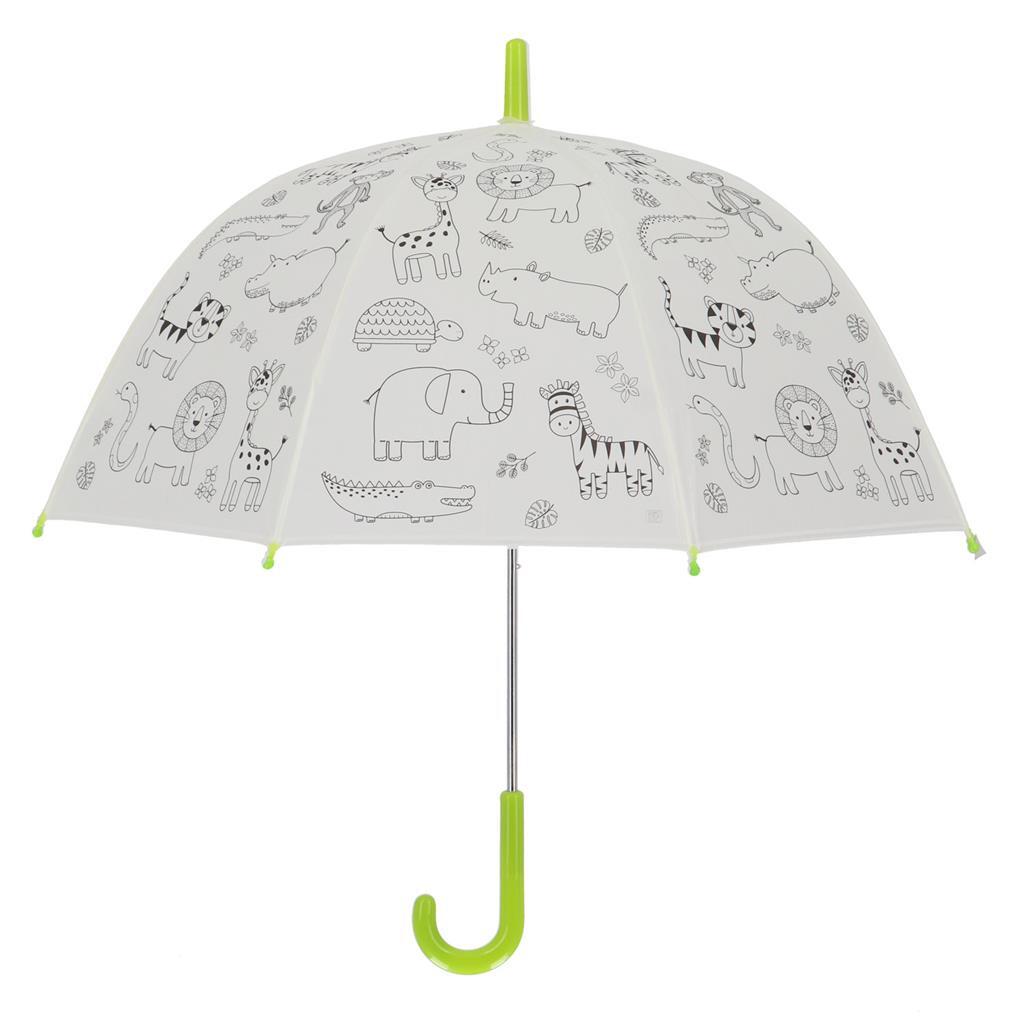 Maak nu je eigen mooie paraplu met deze leuke inkleurparaplu met jungledieren. Inclusief 9 stiften.