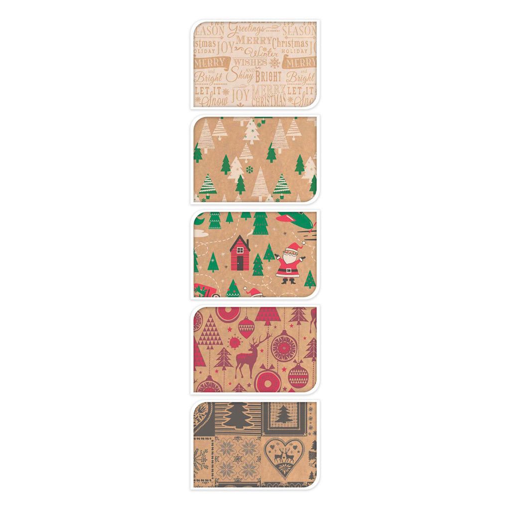 Set kerst inpakpapier in kraftstijl. In de set zitten 5 rollen inpakpapier, 3 rollen lint en 3 cadeaustrikken.