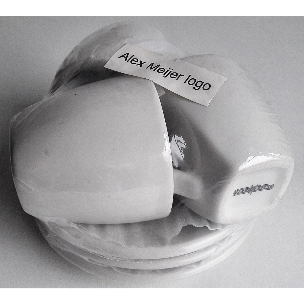 3 originele, professionele, espresso kop en schotels van stevig porcelein methet logo van AlexMeyer en Co, koffiebranders sinds 1839. Inhoud 8 cl.