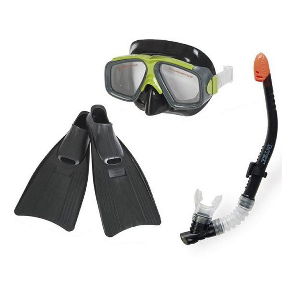 De set bestaat uit een bril, flippers en een snorkel en is ideaal voor het (onder water) zwemmen in zwembaden, zeeën en rivieren. De bril, is gemaakt van polyester met randen van hypoallergeen thermoplastisch rubber wat zorg voor een zachte, comfortabel pasvorm. De flippers van de set zijn gemaakt van PVC met een hoge dichtheid polymeer. De flippers zijn gemaakt voor schoenmaat 41 - 45. De snorkel is gemaakt van siliconen PVC en is voorzien van een extra zacht thermoplastisch mondstuk. Daarnaast is de snorkel geconfigureerd om te voorkomen dat er water door de bovenkant van de snorkel naar binnen gaat. Hierdoor hoeft u dus niet meer bang te zijn om iets te diep te duiken! De set is volledig latex free, dit houd in dat de producten hypoallergenen materialen bevatten die de gebruikers beschermen tegen irriterend latex. Geschikt vanaf 9 jaar.