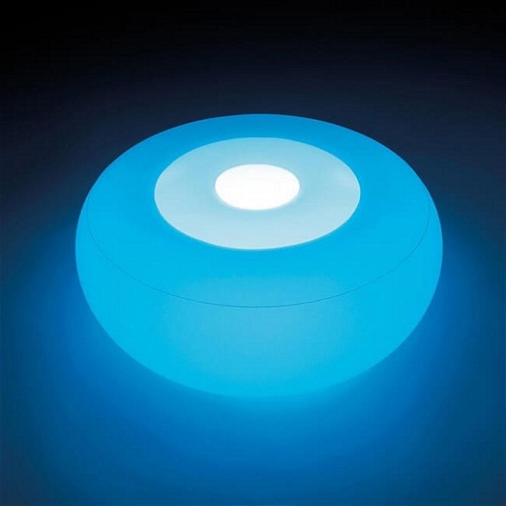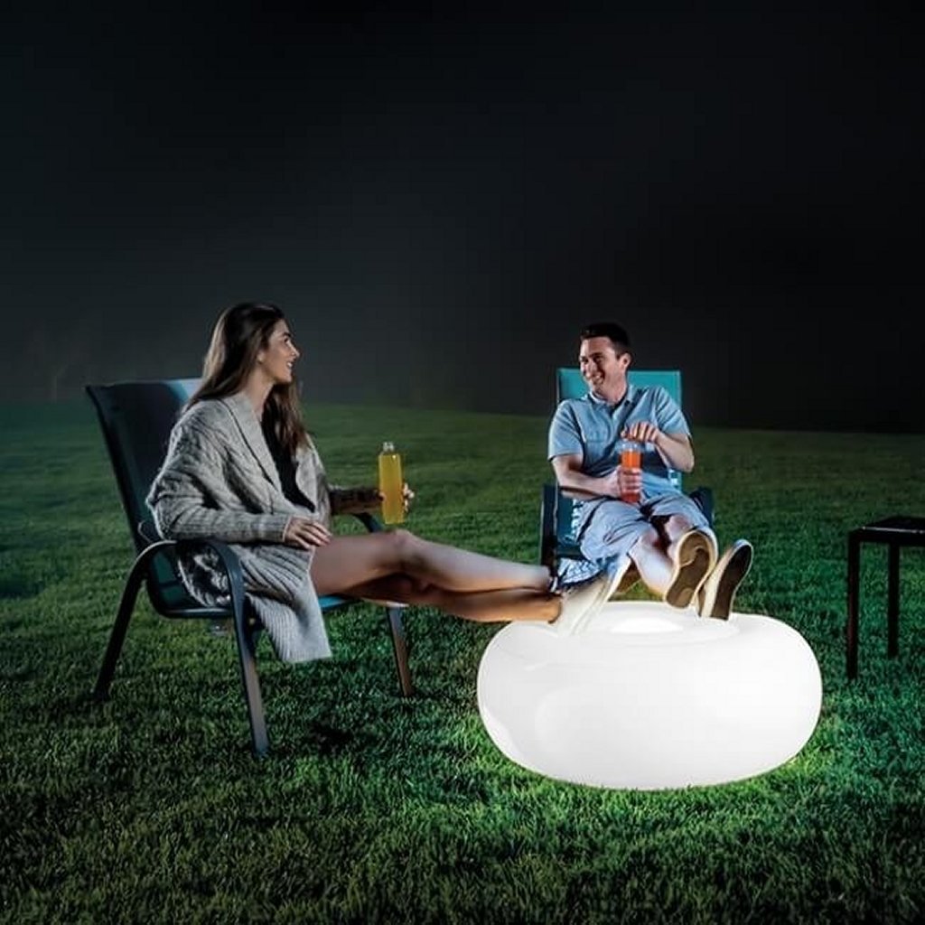 Sfeervol LED licht in de vorm poef. Het opblaasbare LED licht is geschikt voor indoor en outdoor gebruik en is voorzien van een oplaadbare batterij (brandtijd min. 5 uur). De opblaasbare lamp kan branden in wit licht, of in 6 afwisselende kleuren. De lamp schakelt zichzelf na 5 uur automatisch uit. Na gebruik kan de batterij opgeladen worden met de meegeleverde USB kabel (let op: geen stekker meegeleverd).
