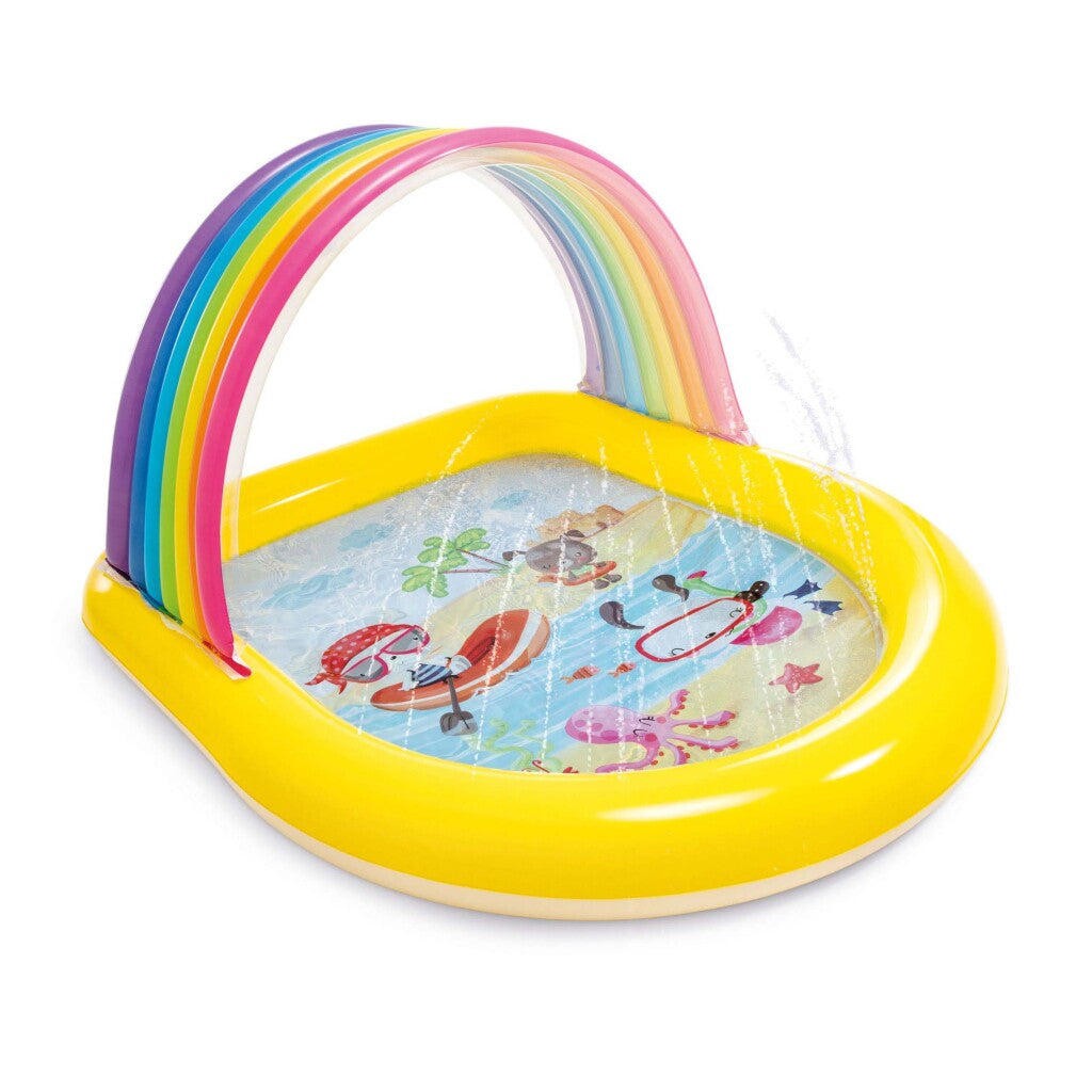Vrolijk zwembadje voor kinderen vanaf 2 jaar. Het zwembad heeft een gele opblaasbare rand en de bodem is bedrukt met een leuke print. Het dakje in de kleuren van de regenboog zorgt voor wat extra schaduw. Door een tuinslang op het zwembadje aan te sluiten komen er kleine waterstralen uit de zwembadrand sproeien. Het zwembad kan gevuld worden met 10 cm water (84 liter).