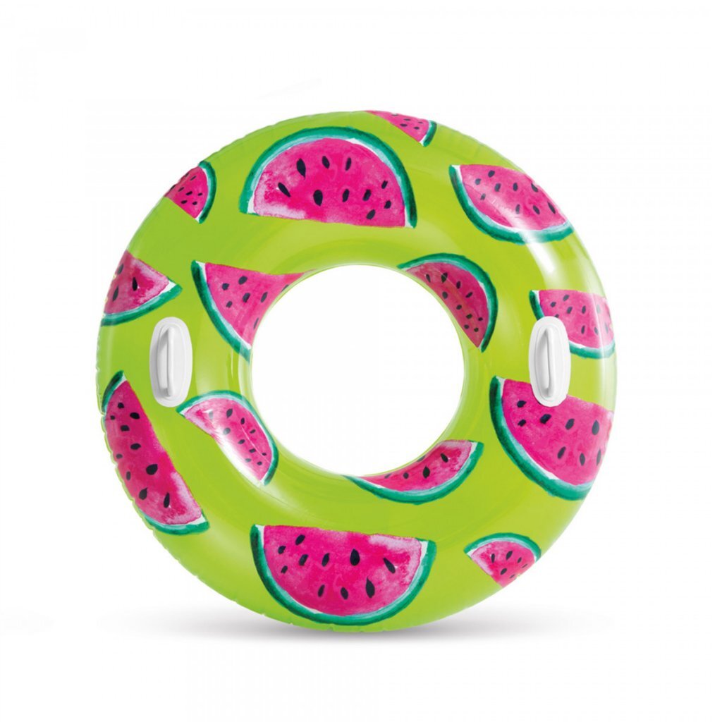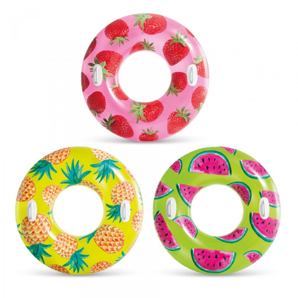 Zomerse zwemband in drie verschillende prints: ananas, meloen en aardbei. De zwemband heeft een diameter van 107 cm, is gemaakt van 0,25 mm stevig vinyl en heeft twee handgrepen om je aan vast te houden. Maximale belasting: 80 kg.