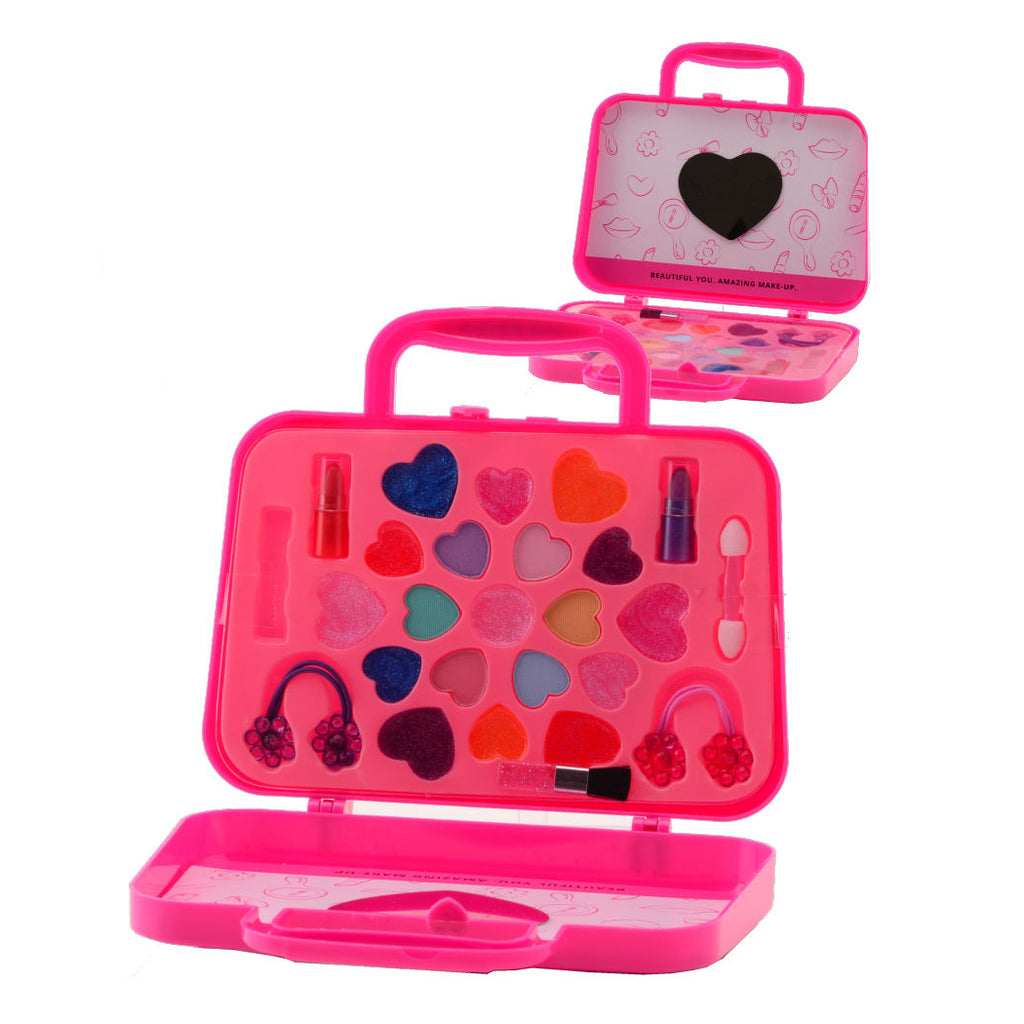 De koffer is gevuld verschillende kleuren lipgloss en oogschaduw in hartjesvorm en lippenstift. Ook zitten er twee haarelastiekjes met bloemetjes en een spiegel in de koffer. De koffer is geschikt vanaf 5 jaar.