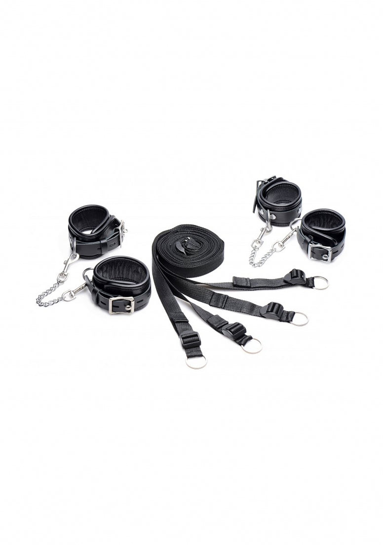 Verander je bed onmiddellijk in een bondage meubelstuk, en schik je geliefde naar eigen inzicht! Ze zullen kronkelen in extase terwijl je hun hulpeloze lichaam behaagt, plaagt en kwelt. De stevige leren boeien zijn gevoerd met comfortabele voering, zodat je speeldinges polsen en enkels niet pijnlijk worden als de speelsessies tot lang in de avond duren. Elke boeien set wordt geleverd met een verbindingsketting voor gebruik zonder de bedriemen. De gesp vergrendelt zodat je minnaar zich nog heerlijker opgesloten en opgesloten voelt. Schuif de bandenset gewoon onder je matras en trek de boeien aan de hoeken omhoog. Verstel de riemen naar behoefte om in alle bedmaten te passen. Geef je seksleven meer pit en je zult nooit meer uit bed willen!