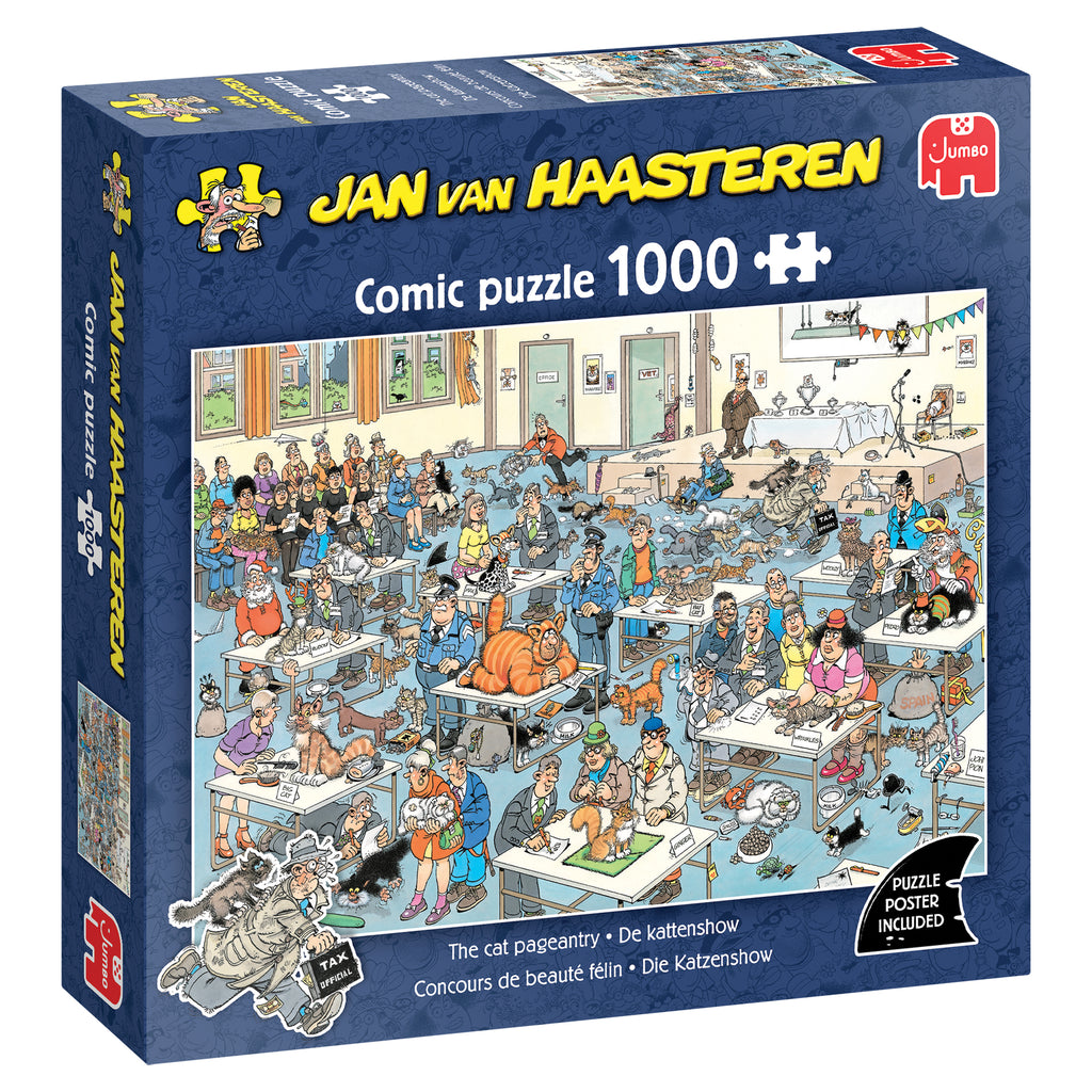 Bij de Kattenshow draait alles om het pronken met mooie katten. Maar zijn alle deelnemers echt katten of zijn er ook valsspelers? De juryleden hebben het moeilijk om hun winnaars te selecteren met alle chaos om hen heen. En zie jij de originele kat uit de familie Jan van Haasteren? Een Jan van Haasteren puzzel is meer dan een gewone legpuzzel: het is een avonturenserie, met vertrouwde hoofdrolspelers in een eindeloos decor vol absurde details. Ontdek alle doldwaze avonturen van de Jan van Haasteren - familie! We zijn trots dat onze puzzels zijn gemaakt van gerecycled karton in Europa. Om het karton in puzzelstukjes te snijden, gebruiken we het dunste mes dat er is. De puzzel ziet er bijna naadloos uit als hij klaar is. Geniet van deze Jan van Haasteren - puzzel!