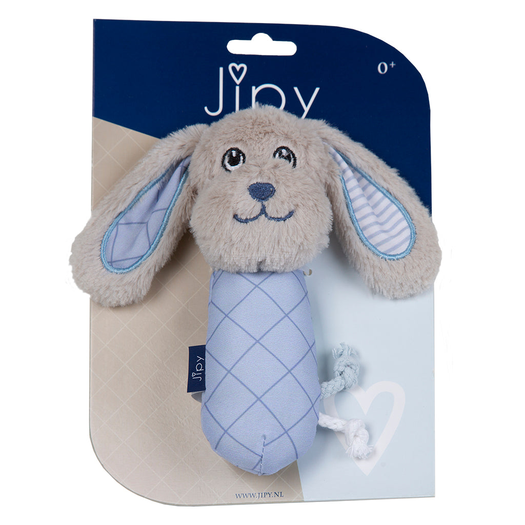 Kinderen kunnen knijpen en rammelen met dit blauwe rammel-knijphondje vanJipy. Wasbaar op 30ºC. Geschikt vanaf de geboorte.