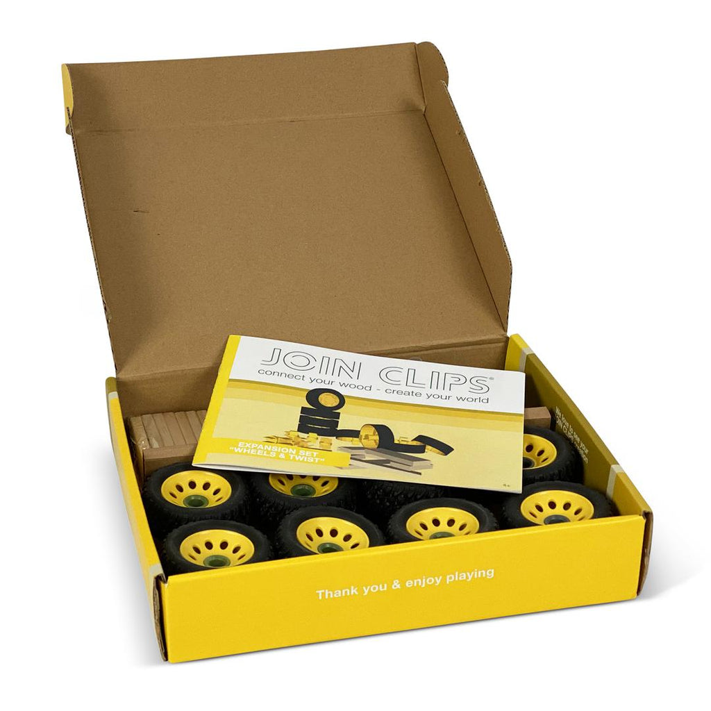 JOIN CLIPS uitbreidingsset WHEELS & TWIST. Alleen speelbaar met JOIN CLIPS BASIC SET HOME of PRO-editie. Ook te combineren met andere merken bouwplanken van ±7,9mm.