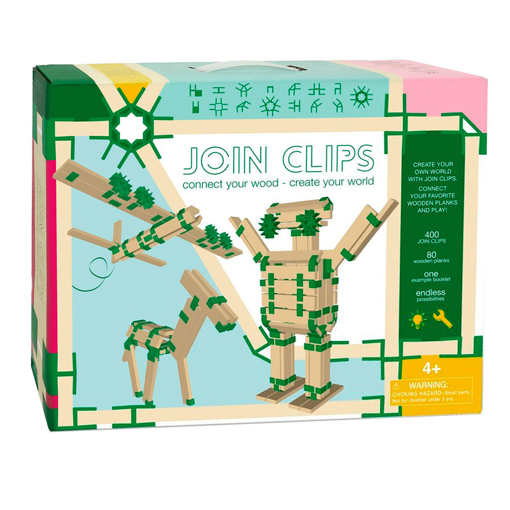 Join Clips is een nieuw product ontworpen en bedacht om met houten plankjes te kunnen bouwen en spelen. Waar je normaal alleen met de plankjes kan opstapelen, kan je ze nu ook gebruiken om vast te maken en met je eigen gemaakte creatie te spelen! Bouw vliegtuigen, dieren, boten en bruggen - het kan nu met Join Clips! Inhoud: 400 join clips, 80 plankjes en een voorbeeldenboekje. Geschikt voor de bouwplankjes van Kapla en andere bekende merken.