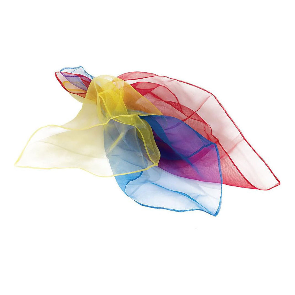 Acrobat setje jongleersjaaltjes in opbergnetje. Inhoud: 3 gekleurde nylon sjaaltjes van 70 x 70 centimeter groot.