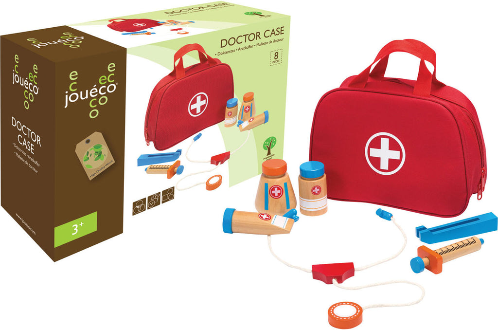 In deze Joueco Dokterstas met 11 Accessoires zit van alles om iedere patiënt weer beter te maken. Luister naar het hart en de longen met de stetoscoop, smeer een zalfje met de crème, meet de temperatuur of geef een prikje. Jij bent de dokter van dienst! Vanaf 3 jaar.