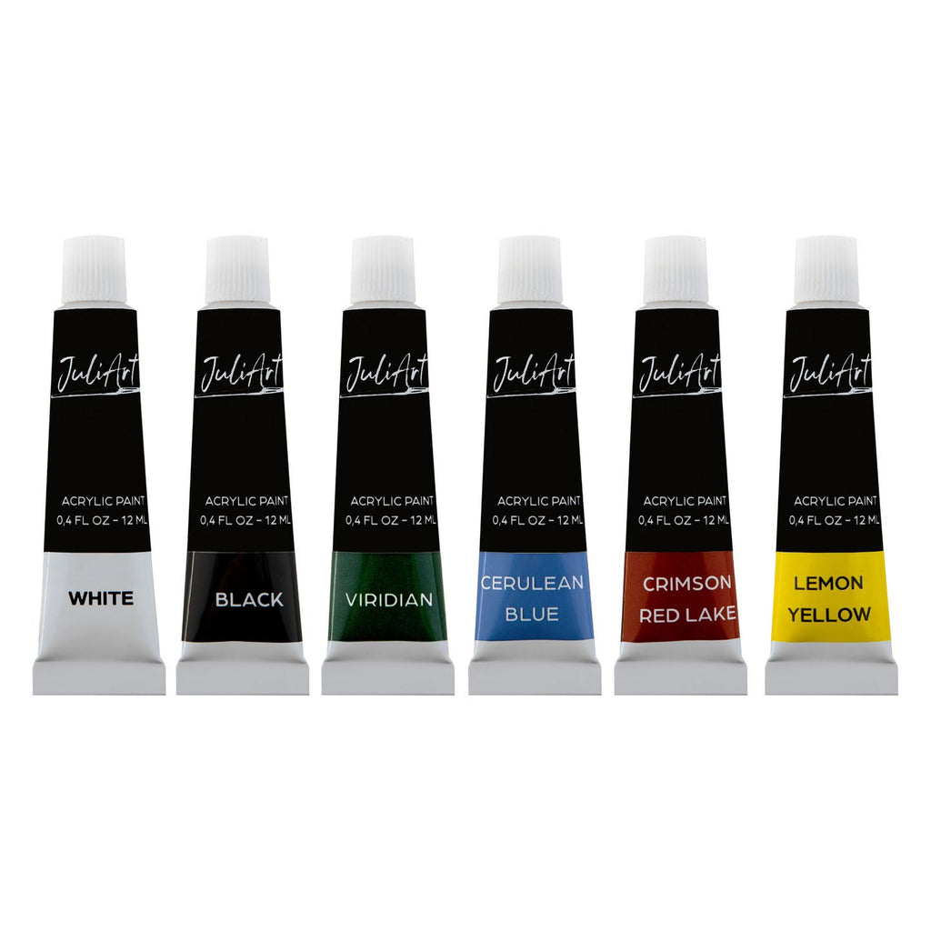 Set van zes tubes acrylverf (6x12 ml) in wit, zwart, groen, blauw, rood, geel.