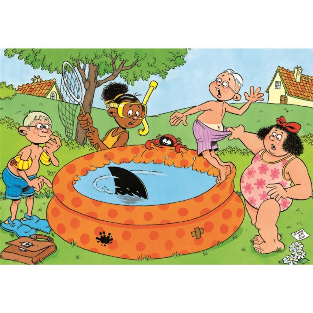 Het is een warme dag en de Jan van Haasteren vriendjes willen een duik nemen in het zwembadje in de tuin. Plots zien ze een haaienvin in het water! Is dat wel echt? Of is het Jan die een grap met ze uithaalt? Deze humoristische puzzel van 150 stukjes is geschikt voor kinderen vanaf 5 jaar.