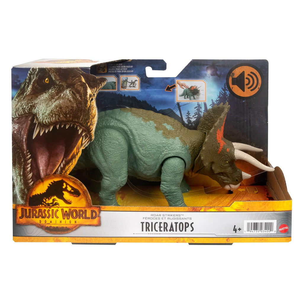 Bereid je voor op spanning en avontuur met deze dinosaurus die is geïnspireerd op Jurassic World Dominion. Deze middelgrote dinosaurusfiguur van Brullende Roofdieren is de Triceratops, voor veel fans de favoriete planteneter. Deze dino maakt niet alleen een echt BRULLEND geluid, maar gaat ook precies zo beukend in de aanval als andere dinosaurussen van deze soort! Geluid en beweging activeer je door het heupgedeelte omlaag te duwen. De Triceratops ziet er echt uit en heeft beweegbare gewrichten, een authentieke vormgeving en realistische kleuren en texturen. Zet de dino in stoere houdingen of verzin je eigen avonturen vol actie. Breng deze dinosaurus TOT LEVEN en speel ook digitaal met augmented reality (AR)! Durf te zien hoe ECHT het spel van de dinosaurussen kan worden! Scan de verborgen DNA-code met elk slim apparaat om de AR-ervaringen te ontgrendelen in de gratis Jurassic World Facts app. Geweldig voor fans van dinosaurussen en actiespellen; geschikt voor 4 jaar en ouder. Slim apparaat niet inbegrepen. Afwijkende kleuren, afmetingen en versieringen mogelijk.