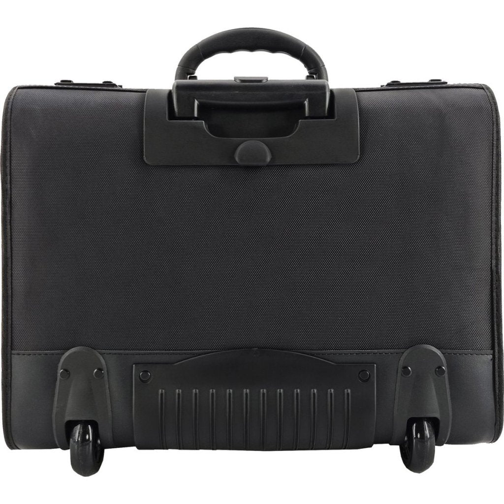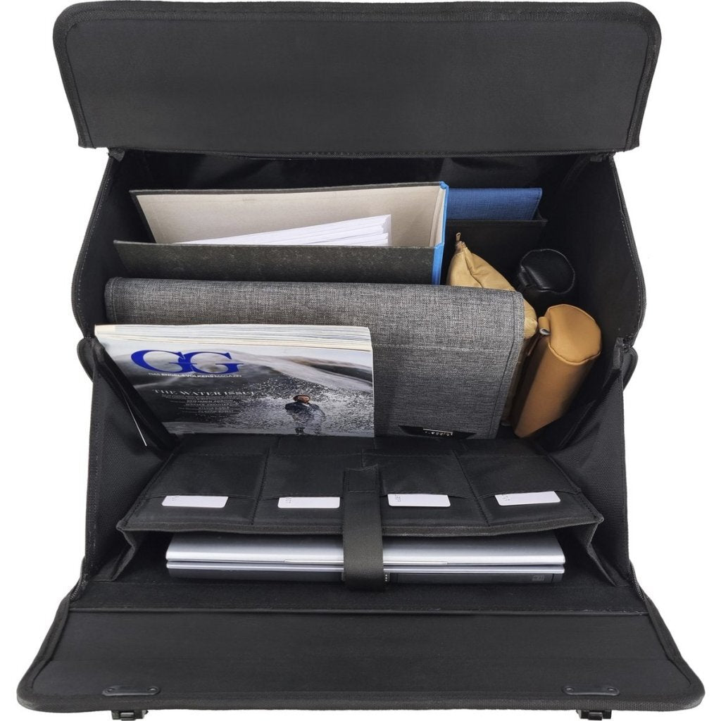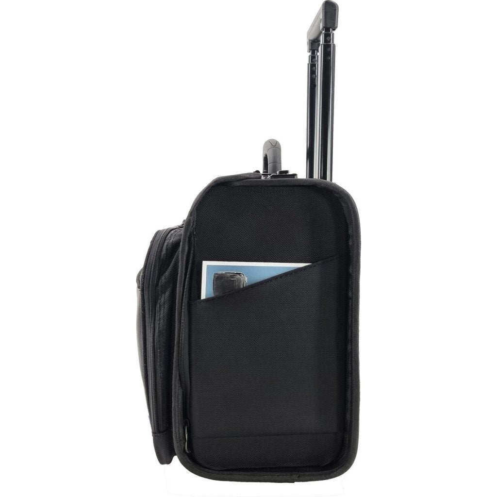 Een afsluitbaar trolleysysteem met twee combinatiesloten. Het heeft een afsluitbaar hoofdvak met gevoerd laptopvak en een extra A4 inschuifvak dat kan worden uitgebreid met twee zijritsen. De koffer heeft 2 voorvakken; een met twee verschillende grote inschuifvakken van gaas, 2 ritsvakken, een gevoerd tabletvak en een gevoerd voorvak met rits. Aan de zijkant zit een inschuifbaar zijvak.