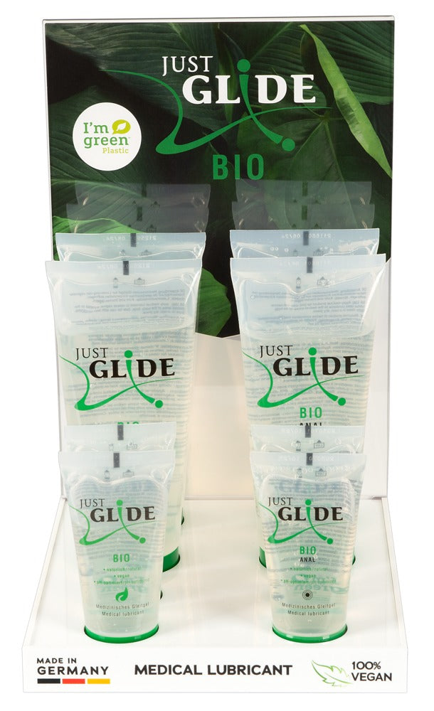10-piece set. A high-quality acrylic shop counter display and an inlay filled with 2 types of Bio lubricant from Just Glide. The lubricants come in two different sizes: