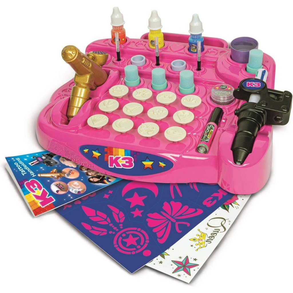 Een fantastische kit voor wie van tattoos houdt. Creëer super coole en trendy tattoos met de meiden van K3! Het spel bevat stencils, lichaamsverf en veel ander materiaal om unieke en originele tattoos te creëren. Bevat een praktische werkbank met vele accessoires. Dit spel stimuleert de creativiteit en stelt kinderen in staat zichzelf te uiten d.m.v. tattoos, waardoor ze een originele look kunnen verzinnen die past bij iedere gelegenheid.