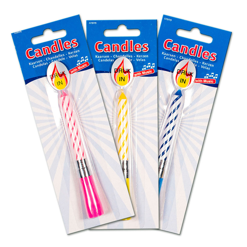 Verjaardagskaarsje met muziek. Wanneer je het kaarsje aansteekt zal 'Happy Birthday' beginnen te spelen. Blaas het kaarsje uit en de muziek stopt.