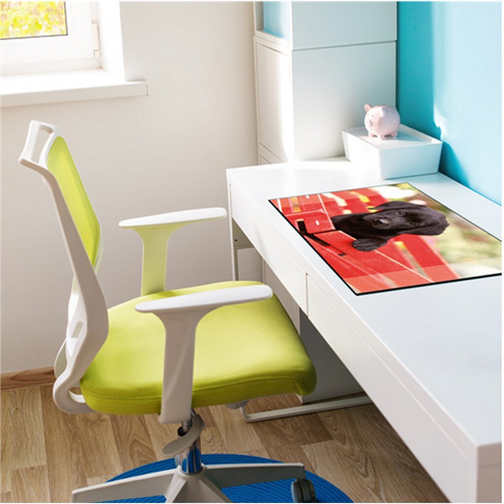 Soepele PP bureau-onderlegger met fraai dessin. Formaat 38x58 cm. Dessin zwarte labrador pup. Met anti-slip achterkant. 100% recyclebaar.