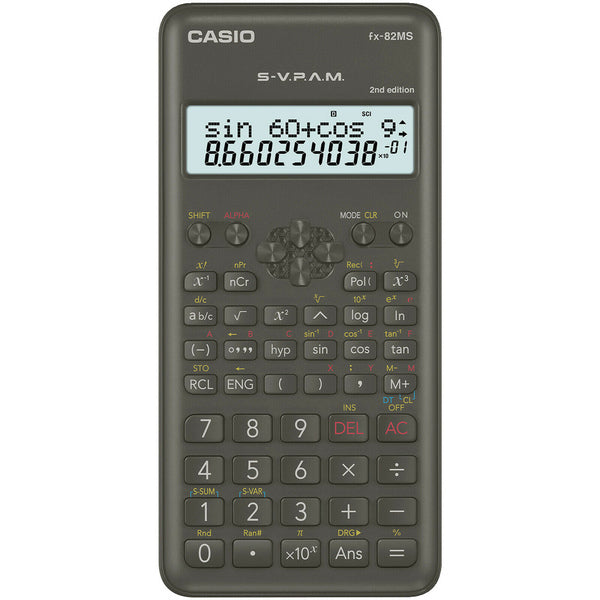 Deze Casio FX-82MS2 heeft een 2-regelige display met bovenaan 12 cijfers en onderaan 10 cijfers + een 2-cijferige exponent. 240 functies waarvan 164 wetenschappelijke. Terugkeertoets naar vorige bewerkingen. Berekeningen in graden, radialen en gradiënten. Trigonometrische functies. Conversie van poolcoördinaten naar rechthoekige coördinaten. Automatische breukberekeningen. Combinaties en permutaties. Beschermd door een stevige hoes. Ft 156 x 85 x 18,6 mm (l x b x d). Werkt op batterijen: 1 x AA