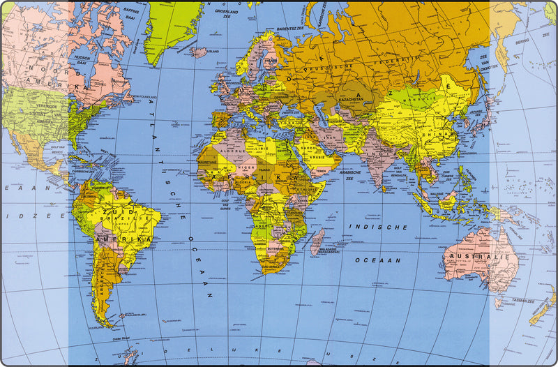 Bureau-onderlegger karton met een stevige kwaliteit kunststof overtrokken. Formaat 579x379cm met wereldkaart.