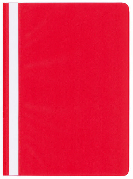 Lichte uitvoering snelhechtermap van PP. Voorzijde in helder transparant PP met een witte indicatiestrook over de volle hoogte. Achterzijde en rug in gekleurde folie. Verpakt per 5 stuks in een krimp, 20 krimp in een doos. Kleur rood.
