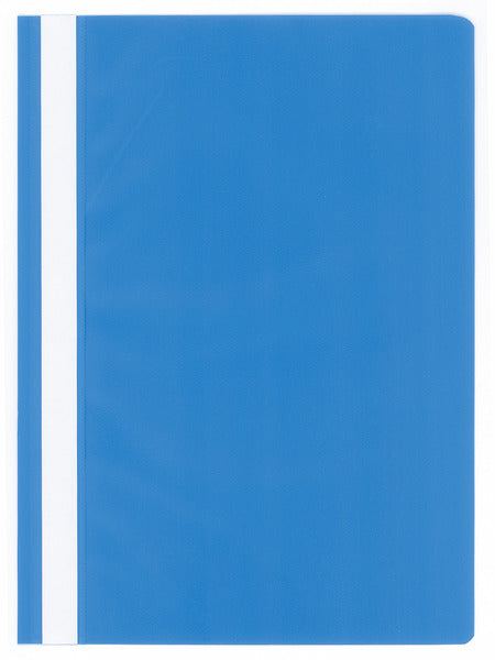 Lichte uitvoering snelhechtermap van PP. Voorzijde in helder transparant PP met een witte indicatiestrook over de volle hoogte. Achterzijde en rug in gekleurde folie. Verpakt per 5 stuks in een krimp, 20 krimp in een doos.Kleur blauw.