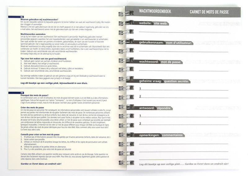 Waarom gebruiken wij wachtwoorden? Om op een bepaalde website bij bepaalde gegevens te komen hebben we vaak een wachtwoord nodig. We moeten dan Inloggen of aanmelden. Meestal is het een gebruikersnaam die de site ons heft gegeven of, en dat gebeurt regelmatig, gebruiken we ons E-mail adres. Het wachtwoord samen met de gebruikersnaam zijn dan een unieke inlog code. Wachtwoorden aanmaken Let op bij het maken van een wachtwoord. Een wachtwoord is persoonlijk. Regelmatig gebruiken mensen persoonlijke gegevens waardoor het voor kwaadwillende vaak gemakkelijk is om wachtwoorden te achterhalen. Zeer vaak worden de namen van partners of kinderen, geboortedata, de naam van hun huisdier of de naam van hun favoriete sportclub gebruikt. Dat is tegenwoordig via social-media vrij eenvoudig te achterhalen. Maak een wachtwoord zo veilig mogelijk door iets te verzinnen wat niet te achterhalen valt. B.v. door een combinatie van hoofd- en kleine letters, bijzondere tekens en/of hoofdletters. Dat is en wachtwoord bijna niet te kraken. Gebruik voor verschillende sites ook verschillende wachtwoorden. Dit boekje helpt erbij om dit allemaal bij te houden.