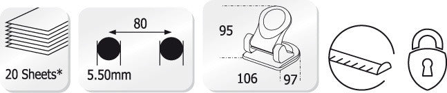 Voordelige kantoorperforator voor ieder bureau. Stevig verstelbare aanleg, goed leesbare formaataanduiding. Capaciteit maximaal 20 vel. Handige bovendeel-vergrendeling voor ruimtebesparend opbergen. Matalen apparaat. Passend bij nietmachines 'Trendy'.