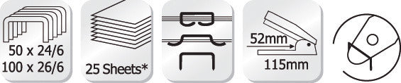 Handige tafelnietmachine. Kunststof body met metalen mechanisme. Bovenlaadmechanisme voor snel herladen. Opbergruimte voor nietjes. Met geïntegreerde ontnieter. Voorzien van roterend aambeeld en reload indicator. Capaciteit maximaal 25 vel. Kleur wit. Passend bij de perforator Aion 10G.