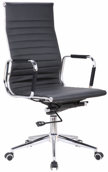 Heerlijke bureaustoel met zitting en rugleuning van PU leer. Tevens stukken PU leer om de armleuningen. De stoel is hoogte verstelbaar middels een gasveer en heeft een kantelmechanisme voor een relaxte houding. Met de draaiknop onder de zitting is het kantelen van de stoel af te stemmen op je lichaamsgewicht. De stoel is 360 graden draaibaar om zijn eigen as. Stoel heeft universele wieltjes, geschikt voor zowel tapijt als harde vloeren. Hoogte rugleuning: 108 - 114 cm. Hoogte armleuningen: 66 - 72 cm. Hoogte armleuningen vanaf zitting: 20 cm. Zithoogte: 45 - 51 cm. Zitdiepte: 44 cm. Breedte: 48 cm (tussen armleuningen). Materiaal bekleding: PU Leder. Kleur: zwart en chroom.Tot maximaal 120 kg.