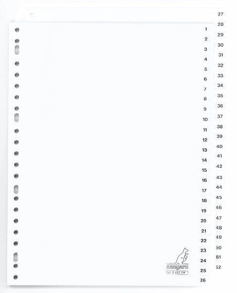 Tabbladen wit PP 120 mµ. De tabs zijn éénzijdig zwart bedrukt met cijfers 1-52. A4. 23-gaats.