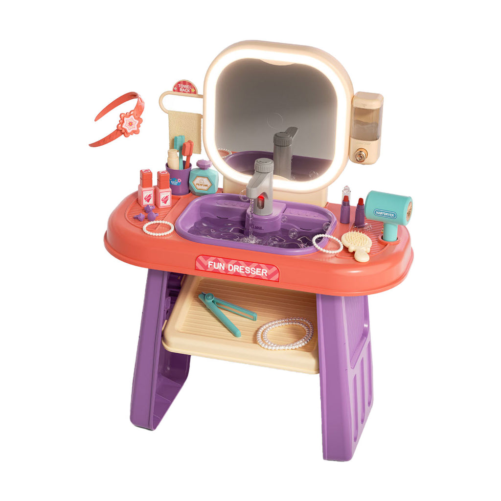 Kap- en wastafel met echt werkende kraan. Inclusief allerlei accessoires voor je haar en make-up. Paars en oranje gekleurd. Geschikt voor kinderen vanaf 3 jaar oud.