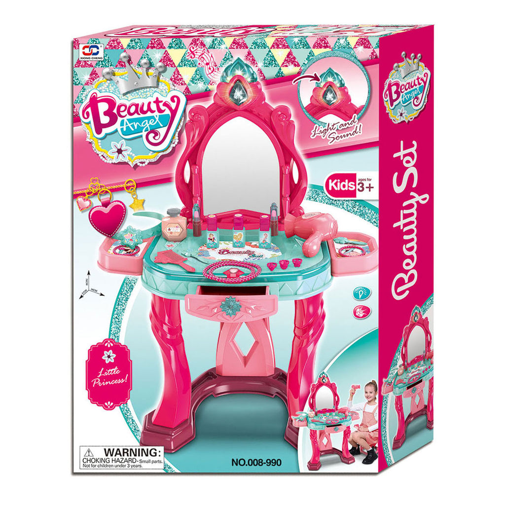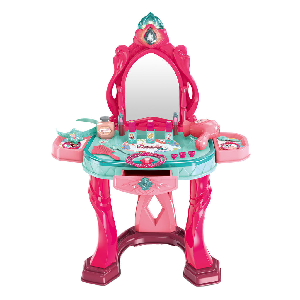 Prinsessen kaptafel met spiegel. Met licht en geluid. Blauw met roze gekleurd. Gemaakt van kunststof. Inclusief beauty accessoires. Met licht- en geluidseffecten. Geschikt voor kinderen vanaf 3 jaar oud.