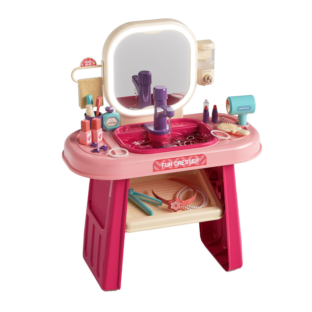 Kap- en wastafel met echt werkende kraan. Inclusief allerlei accessoires voor je haar en make-up. Licht- en donkerroze gekleurd. Geschikt voor kinderen vanaf 3 jaar oud.