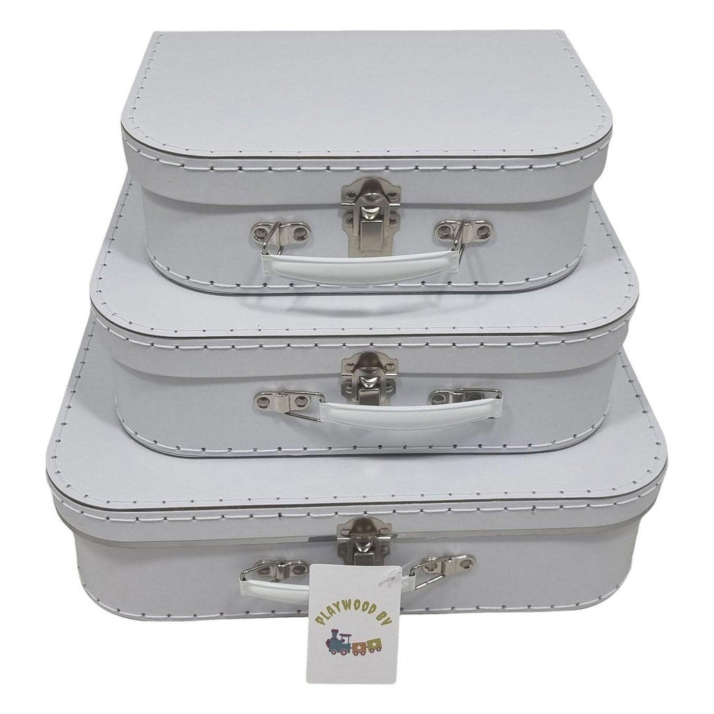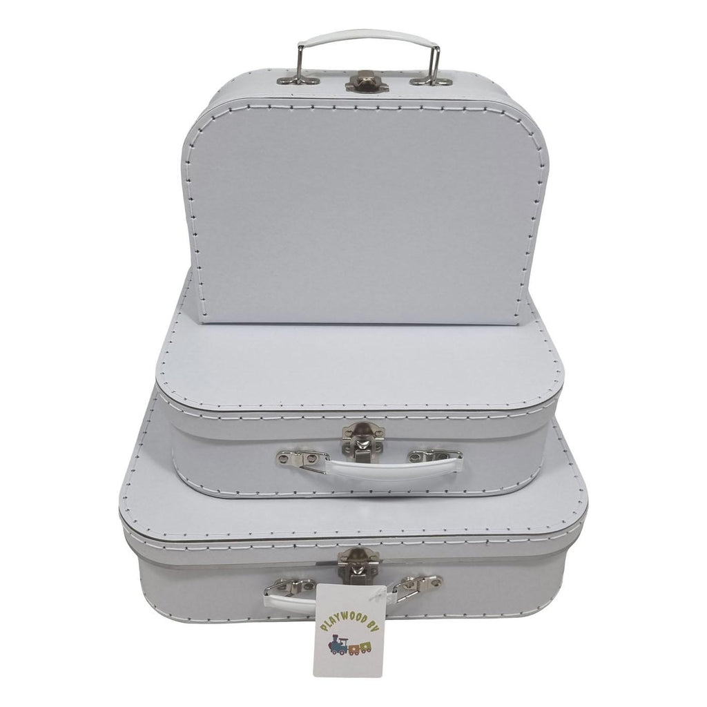 Set van 3 kartonnen koffertjes, bijvoorbeeld om zelf te versieren. Afmetingen: 25,5 cm (klein), 30 cm (midden) en groot (35,3 cm).