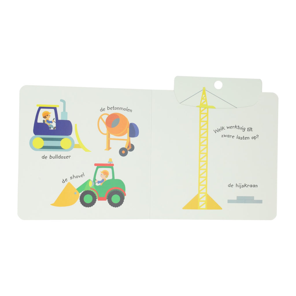 Interactief schuifboekje over voertuigen en gereedschappen op de bouwplaats. Gemaakt van stevig karton en geschikt vanaf 18 maanden.