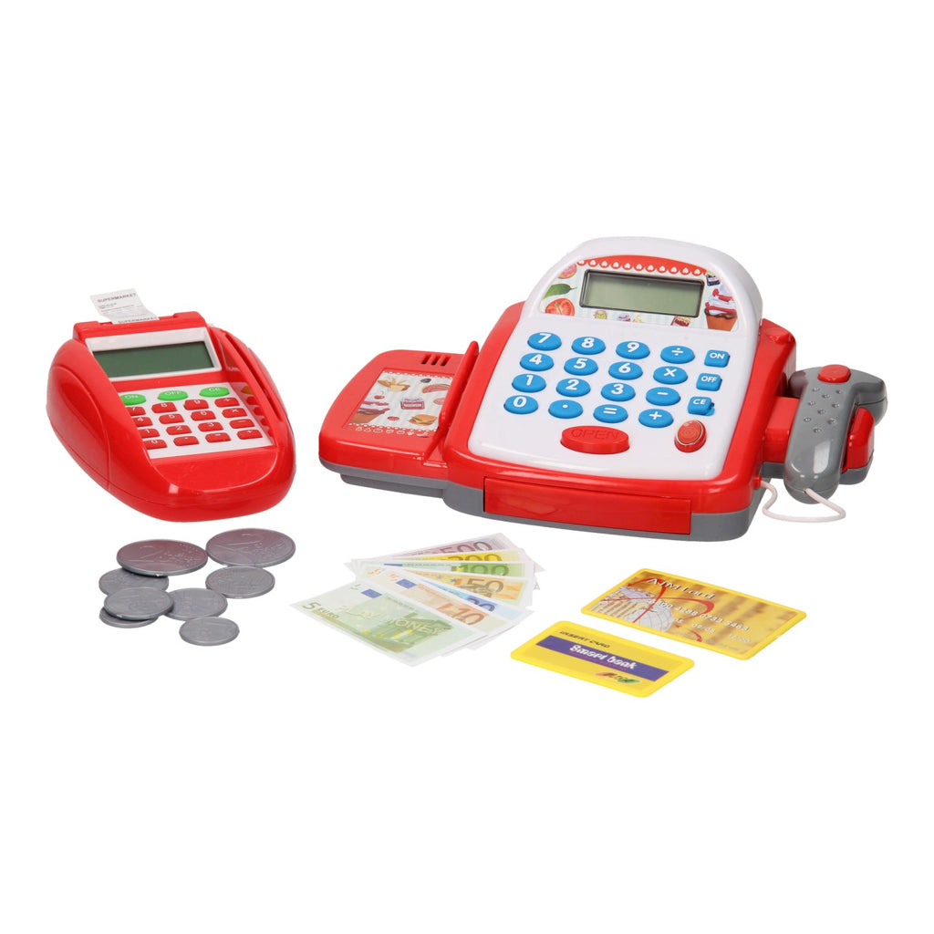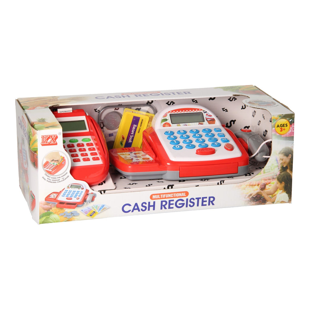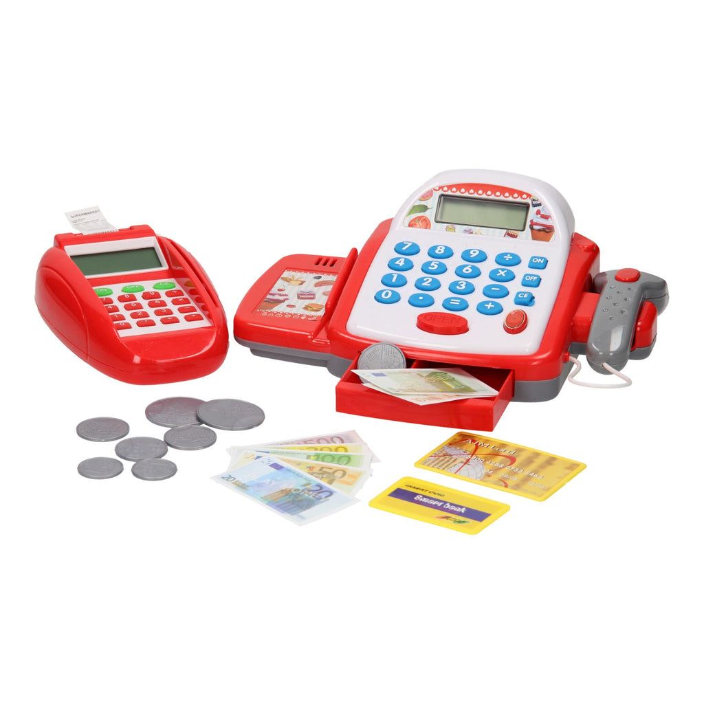 Deze rode kunststof kassa met pinapparaat en displays heeft echte drukknoppen en een echt werkende rekenmachine. De kassa bevat een scanner voor de boodschappen, een loopband en een kassa die geopend kan worden. De kassa wordt geleverd met muntjes, briefpapier, bankpas en bonnetje. Het bonnetje kan uit het pinapparaat gedraaid worden met een tandwieltje. De kassa stimuleert de fantasie bij je kind en is door de werkende rekenmachine ook leerzaam.