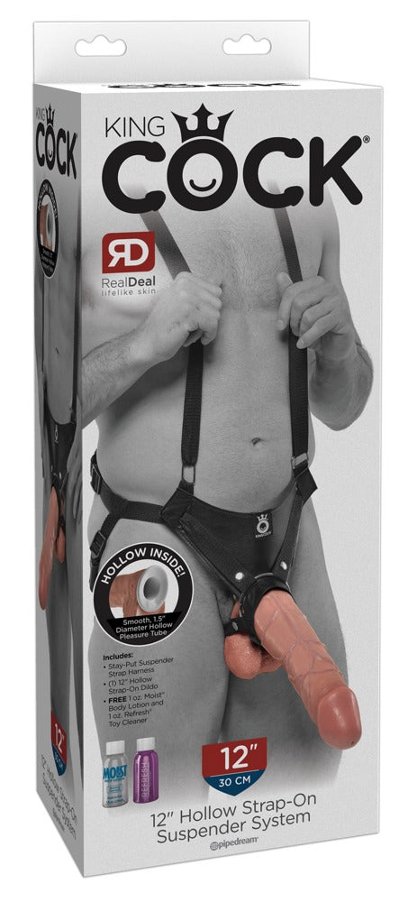 Verwijderbare penis dildo op verstelbaar zwart comfort harnas met bretels. Penis dildo is hol zodat de penis ingebracht kan worden.