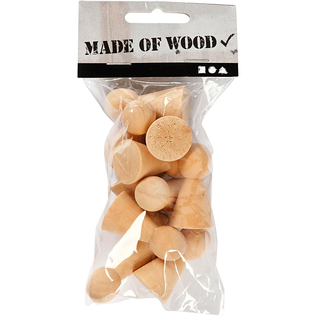 Houten poppen met kegelvormig lijf, hoogte 4 cm, breedte 2,2 cm, 10 stuks per zak.