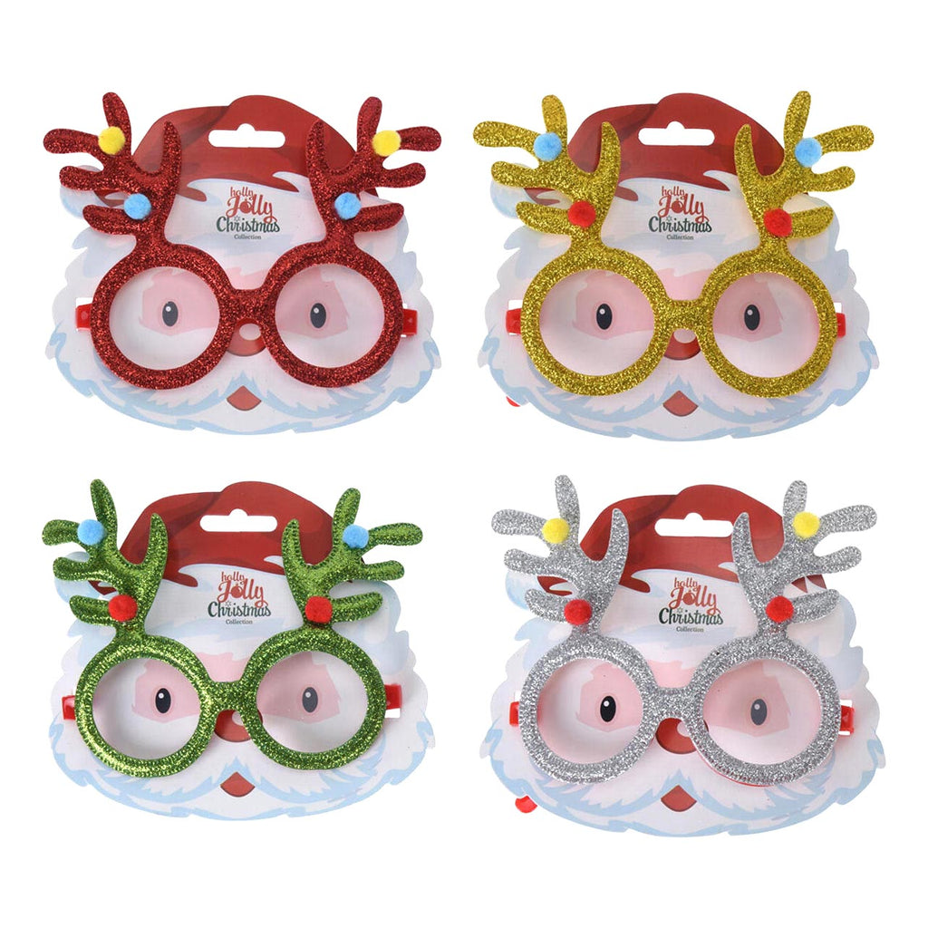 Kerstbril met rendier hoorns, in roodgekleurde glitters. Perfect voor een foute kerstparty.