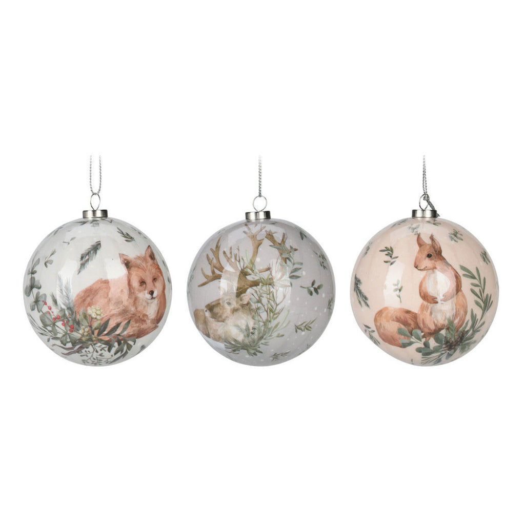 Set van 40 kerstballen met bosdierenillustraties. De kerstballen met prints van vossen, edelherten en eekhoorns zijn ca. 7 centimeter groot en gemaakt van kunststof.