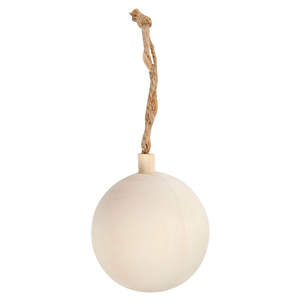 Houten Kerstbal met hanger. De bal heeft een doorsnede van 5,5 centimeter.